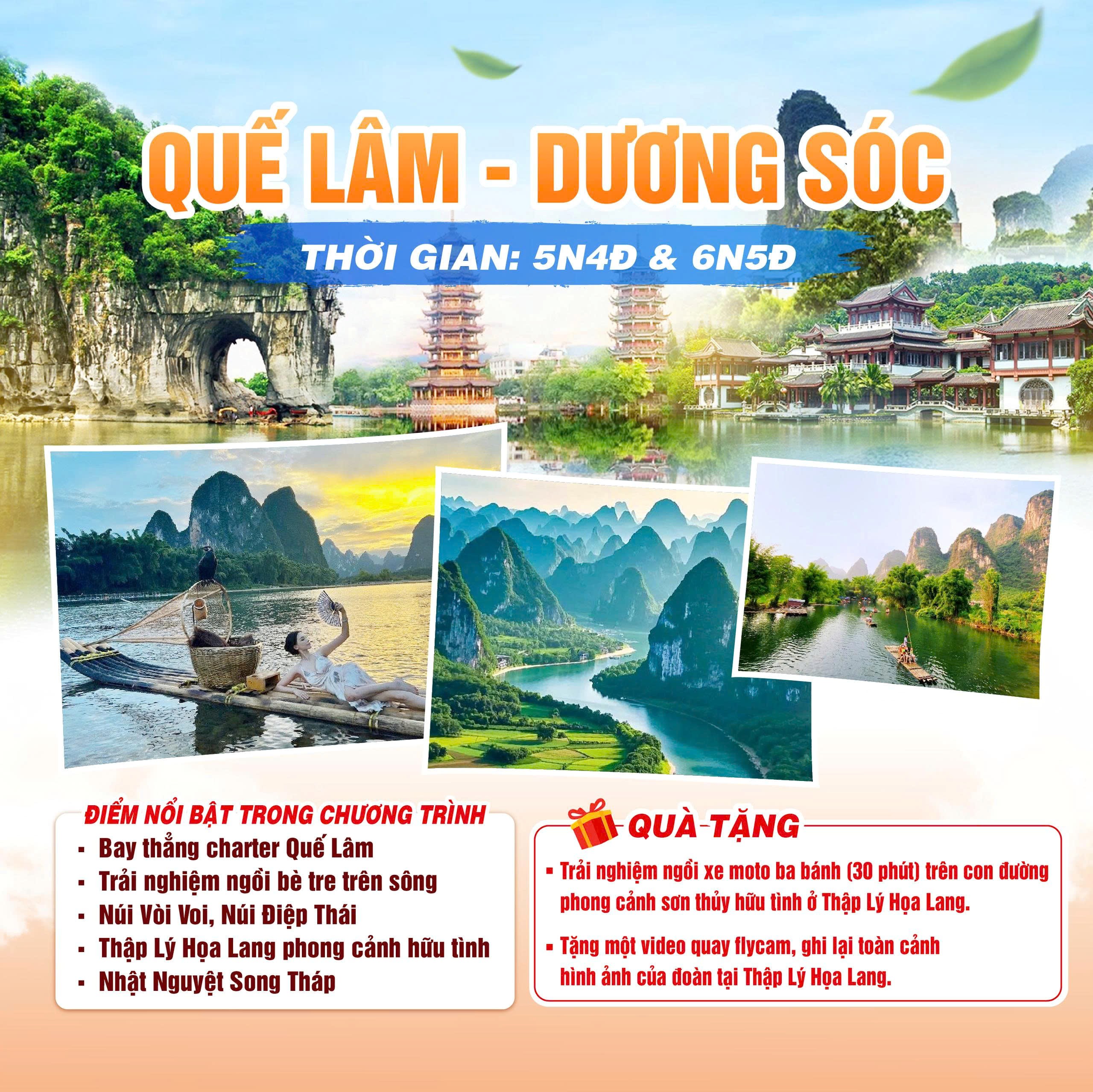 Trưởng đoàn của công ty sẽ đón quý khách tại sân bay Tân Sơn Nhất. Sau đó làm thủ tục cho đoàn đáp chuyến bay đi Quế Lâm- Thành phố du lịch nổi tiếng ở Quảng Tây, được mệnh danh là “Thiên hạ đệ nhất sơn thủy”.